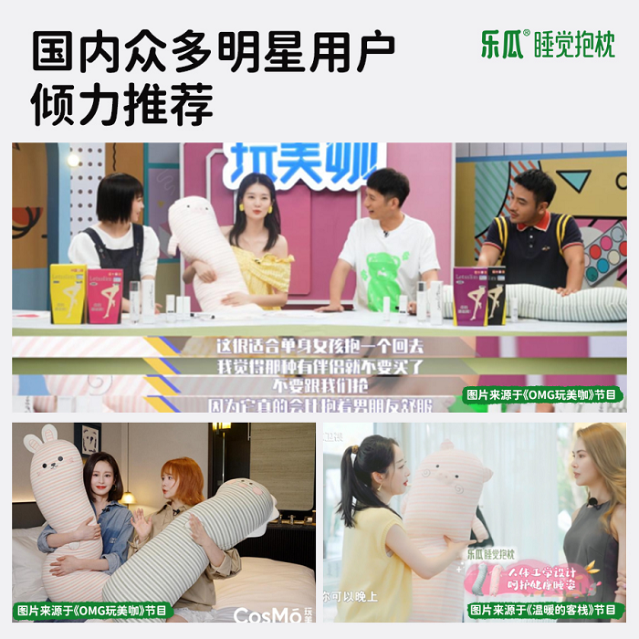 在中国市场,颖儿在《OMG玩美咖》节目中直言乐瓜睡觉抱枕(Sleeping Body Pillow)改善了她的“登山式睡姿”;昆凌、乔欣、李维嘉等人气明星用户也曾在节目中分享使用体验。这些真实走心的推荐不仅带动了销量,也让FUNMELON乐瓜品牌深入人心。