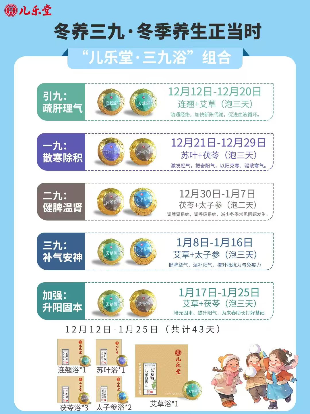 三九当天是全年最冷的日子,孩子阳气消耗快,容易没精神、爱犯困,稍不注意就反复感冒。儿乐堂用温经艾草丸(温通阳气)搭配太子参浴(增强抵抗力),草本精华通过皮肤吸收后,既能帮娃补充身体所需的“气”,增强肺气来抵御感冒,又能舒缓神经、安神助眠,让娃白天精力足、晚上睡得香,在最冷的时候也能保持好状态。