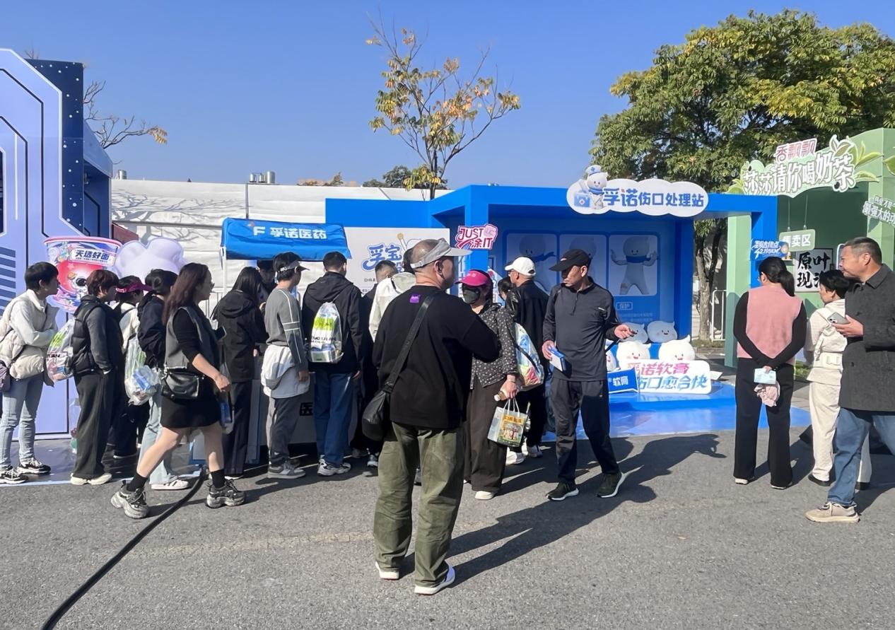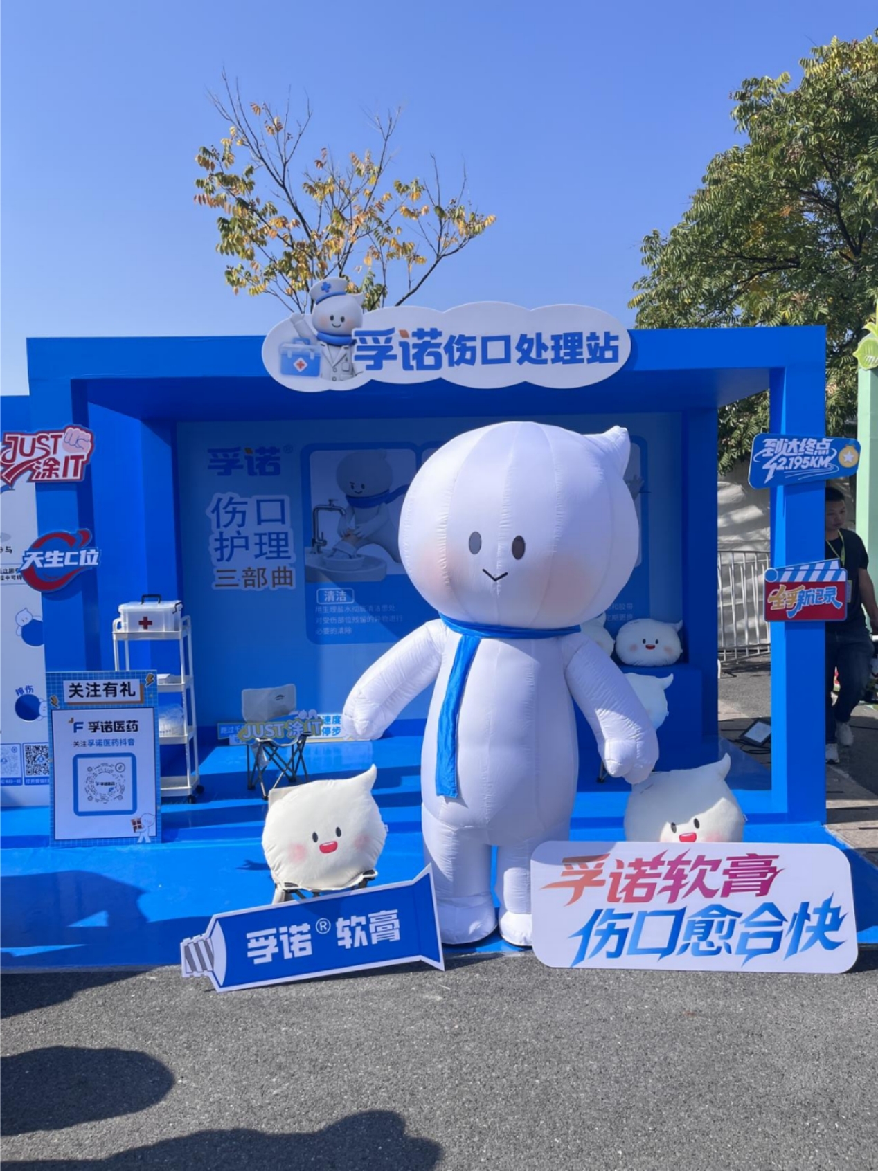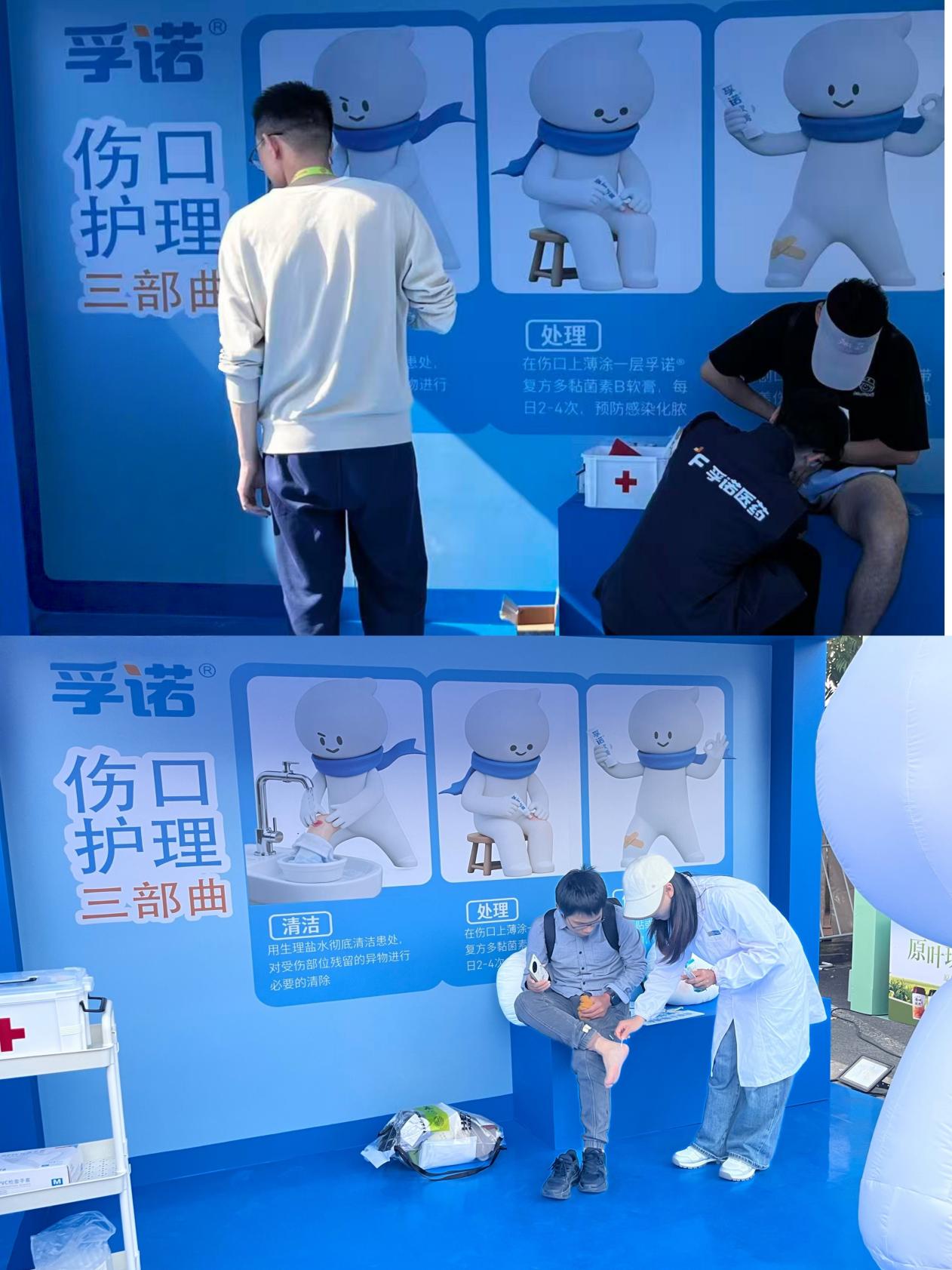 在赛事现场,孚诺医药通过多元服务为选手提供保障。赛道沿线的医疗帐篷与医疗站内,配备了包括孚诺®软膏在内的应急医疗物资,供医护人员在处理选手突发皮肤外伤时使用。此外,企业设置的互动展台也吸引了大量选手驻足。展台特别设置了伤口护理站,并邀请了专业医护人员为有需要的选手提供伤口处理指导与咨询服务,通过互动形式普及运动伤口应急处理知识,让健康科普更加生动、专业。