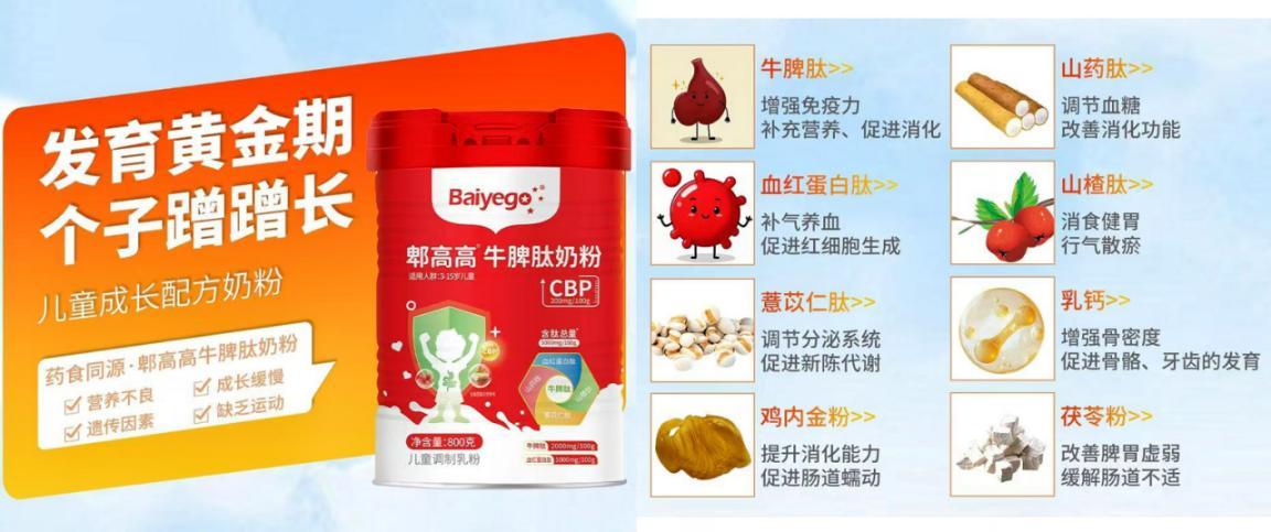 基于“健脾促吸收,营养助生长”的思路,一些儿童营养配方将传统智慧与现代科技相结合。例如百育高郫高高牛脾肽奶粉,其配方不仅关注直接促进骨骼发育的成分如初乳碱性蛋白、骨胶原蛋白肽,更着重添加了牛脾肽、血红蛋白肽等针对性支持消化吸收的活性物质,并融合了山药、山楂、鸡内金、大枣、芡实等药食同源食材的精粹。这种设计旨在帮助孩子打破“不吸收”的瓶颈,力求让吃进去的营养能被高效利用,夯实长高的营养基础。