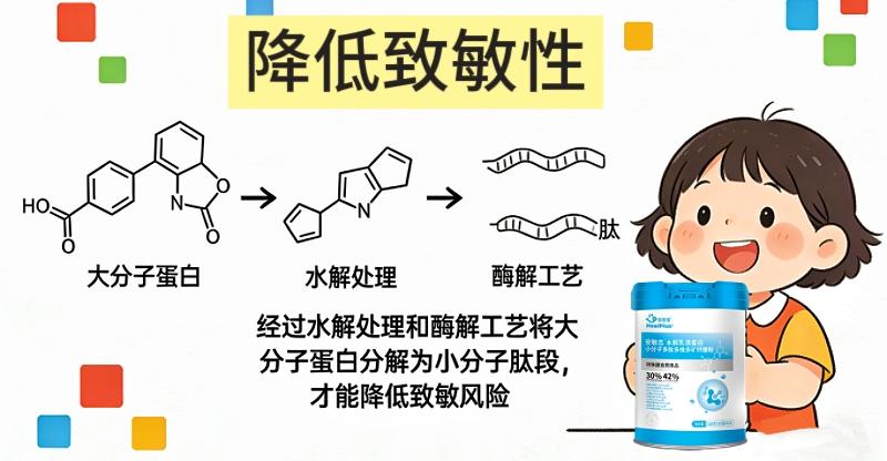 1岁+敏宝肠道屏障尚未发育成熟,大分子牛奶蛋白是主要致敏源。儿科专家明确建议,过敏宝宝需选择蛋白经过水解处理的特殊配方,通过酶解工艺将大分子蛋白分解为小分子肽段,才能降低致敏风险。这里要注意:水解程度和添加比例直接影响低敏效果,行业常见水解乳清蛋白添加量仅10%-13%,而优质配方需达到更高比例才能满足敏宝需求。同时,优先选择规避牛奶、大豆等常见过敏原的配方,减少交叉过敏可能。