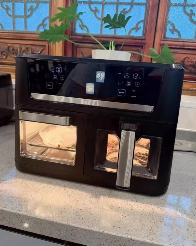 核心亮点:14L超大容量+双仓独立烹饪设计,适配5人以上大家庭;360°全域循环加热,上下双热流,受热均匀无死角,烤出来的食物口感一致;智能触控面板+可视大窗,实时观察食材状态,不用反复抽篮查看;食品级不粘煎篮,可拆卸设计,一冲即净,清洁省心;一机替代空气炸锅、烤箱、煎锅,省空间又实用。